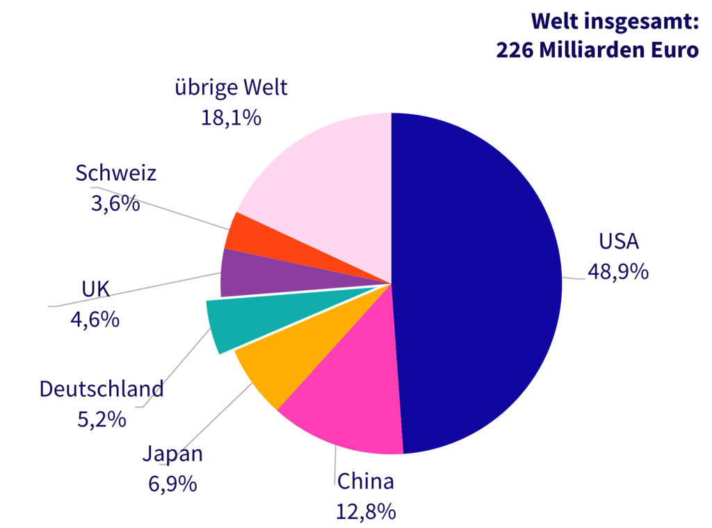 Abbildung: Anteil der internen FuE-Aufwendungen (Chemie & Pharma) der Länder der Welt, 2024, in Prozent; Quelle: Chemdata International, VCI